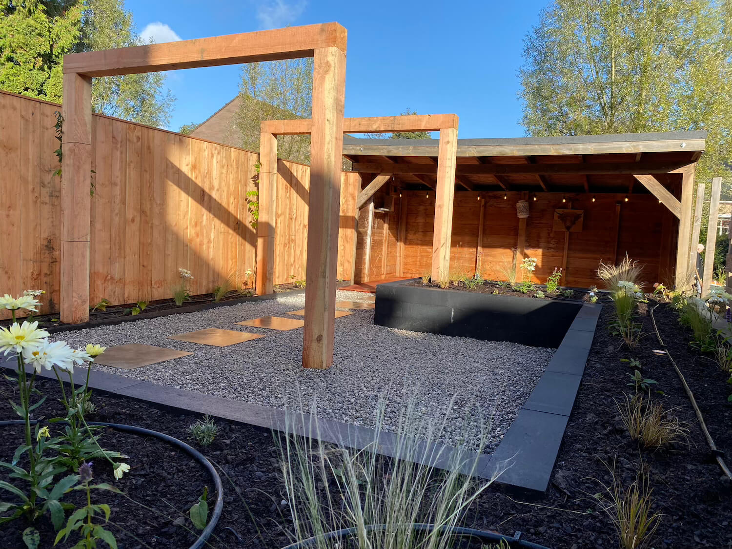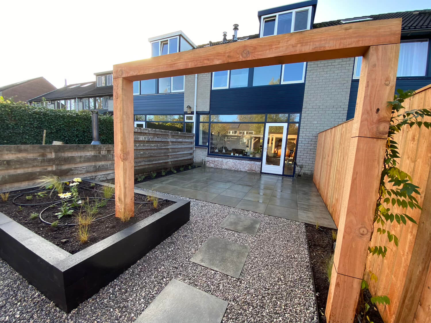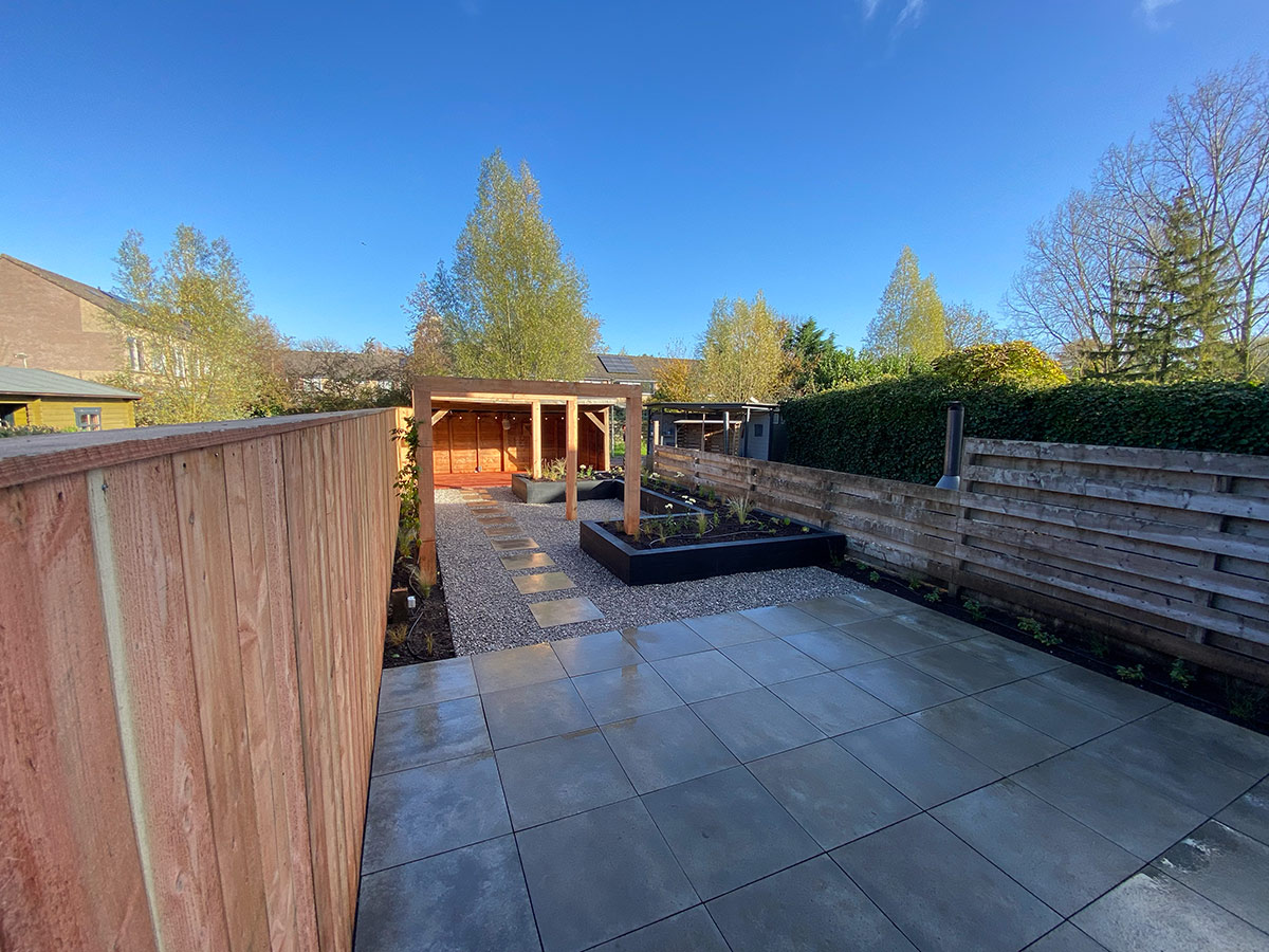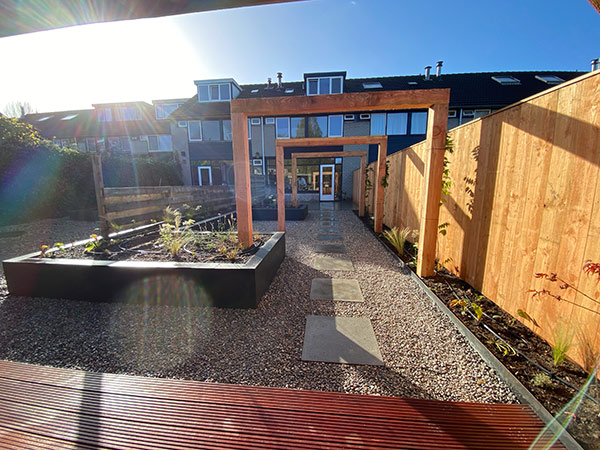 In deze prachtige achtertuin in Arnhem creëerden we een groene en strakke leefwereld. De Bankirai vlonder en de pergola van Douglas hout zijn naast de gestapelde plantenbakken de aandachtstrekkers. Samen met de rijke beplanting zorgen zij voor een optimale tuinbeleving in alle seizoenen van het jaar. De Wisteria (Blauwe regen) op de pergola, maar ook de Alliums Purple Sensation, de prachtige Echinacea en de Rudbeckia Fulgida Goldstorm blijven de aandacht trekken. En in de avond, zorgt het verlichtingsplan met Inlite grondspots voor een betoverend geheel. Het druppelsysteem zorgt voor een gelijkmatige beregening en een optimale zorg voor de beplanting.