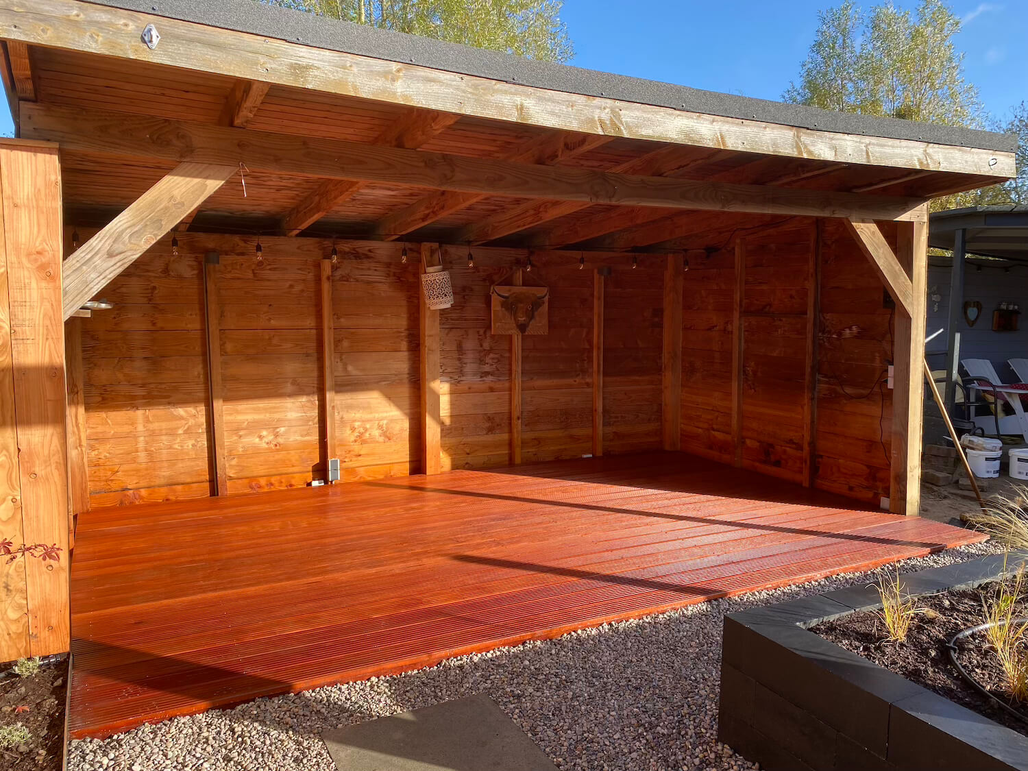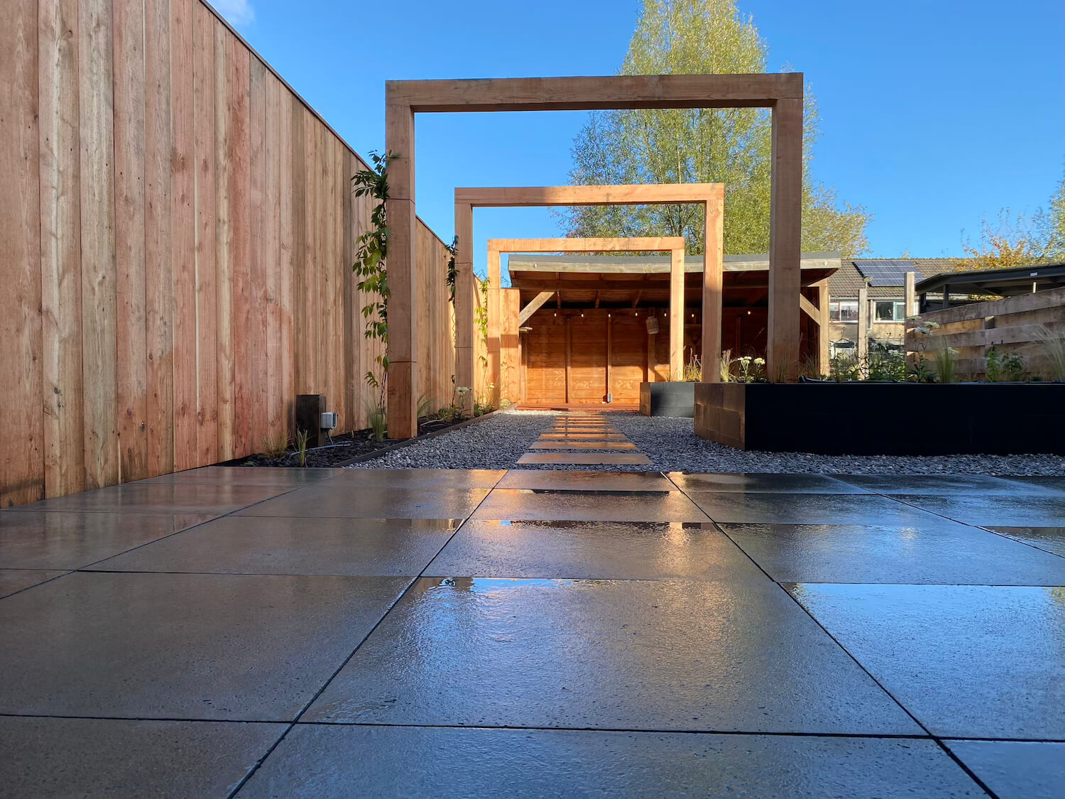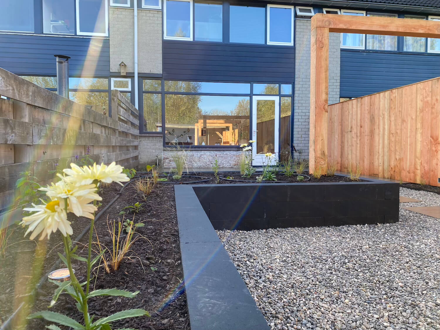 In deze prachtige achtertuin in Arnhem creëerden we een groene en strakke leefwereld. De Bankirai vlonder en de pergola van Douglas hout zijn naast de gestapelde plantenbakken de aandachtstrekkers. Samen met de rijke beplanting zorgen zij voor een optimale tuinbeleving in alle seizoenen van het jaar. De Wisteria (Blauwe regen) op de pergola, maar ook de Alliums Purple Sensation, de prachtige Echinacea en de Rudbeckia Fulgida Goldstorm blijven de aandacht trekken. En in de avond, zorgt het verlichtingsplan met Inlite grondspots voor een betoverend geheel. Het druppelsysteem zorgt voor een gelijkmatige beregening en een optimale zorg voor de beplanting.