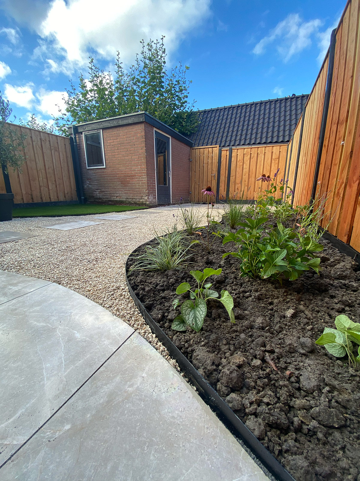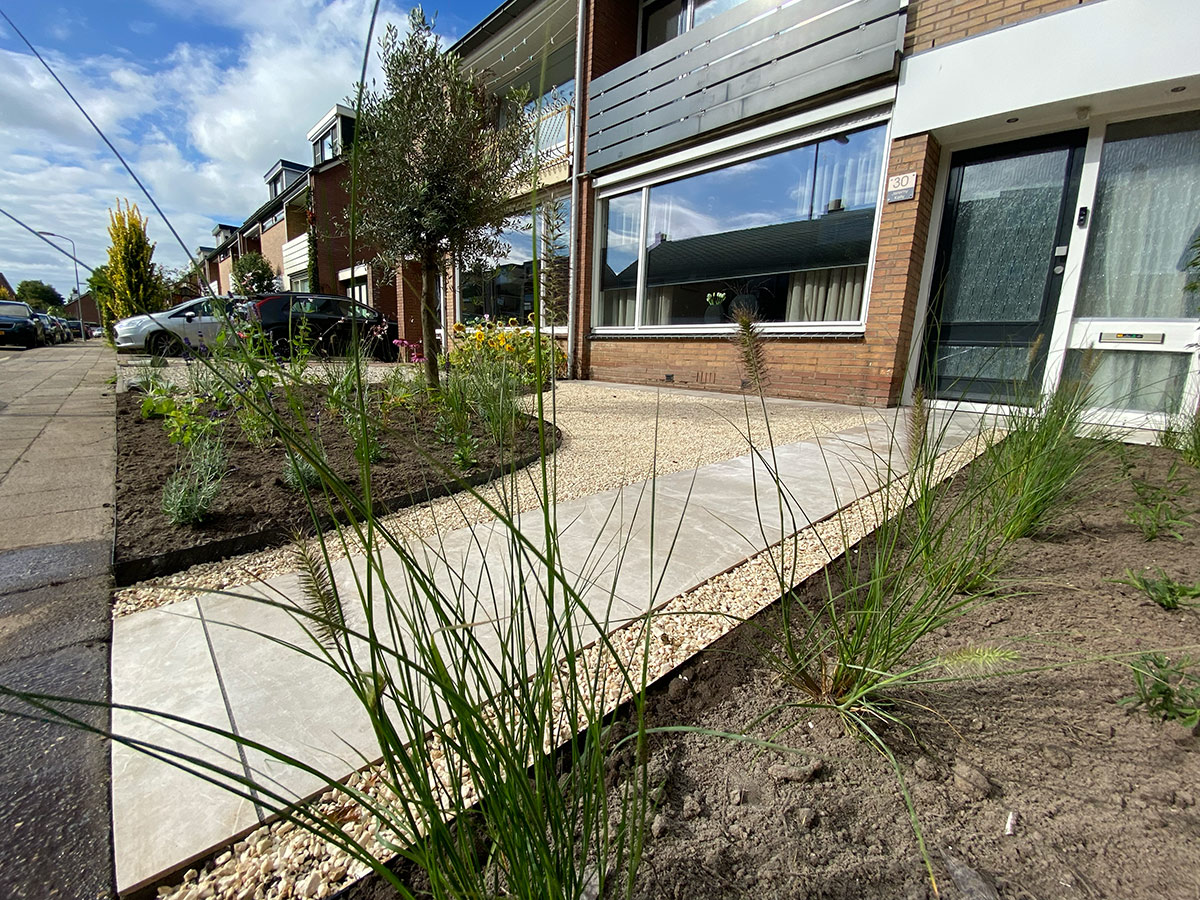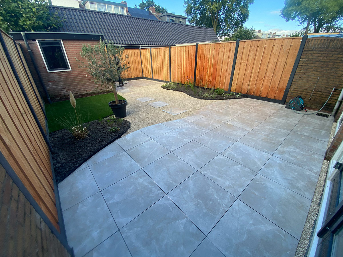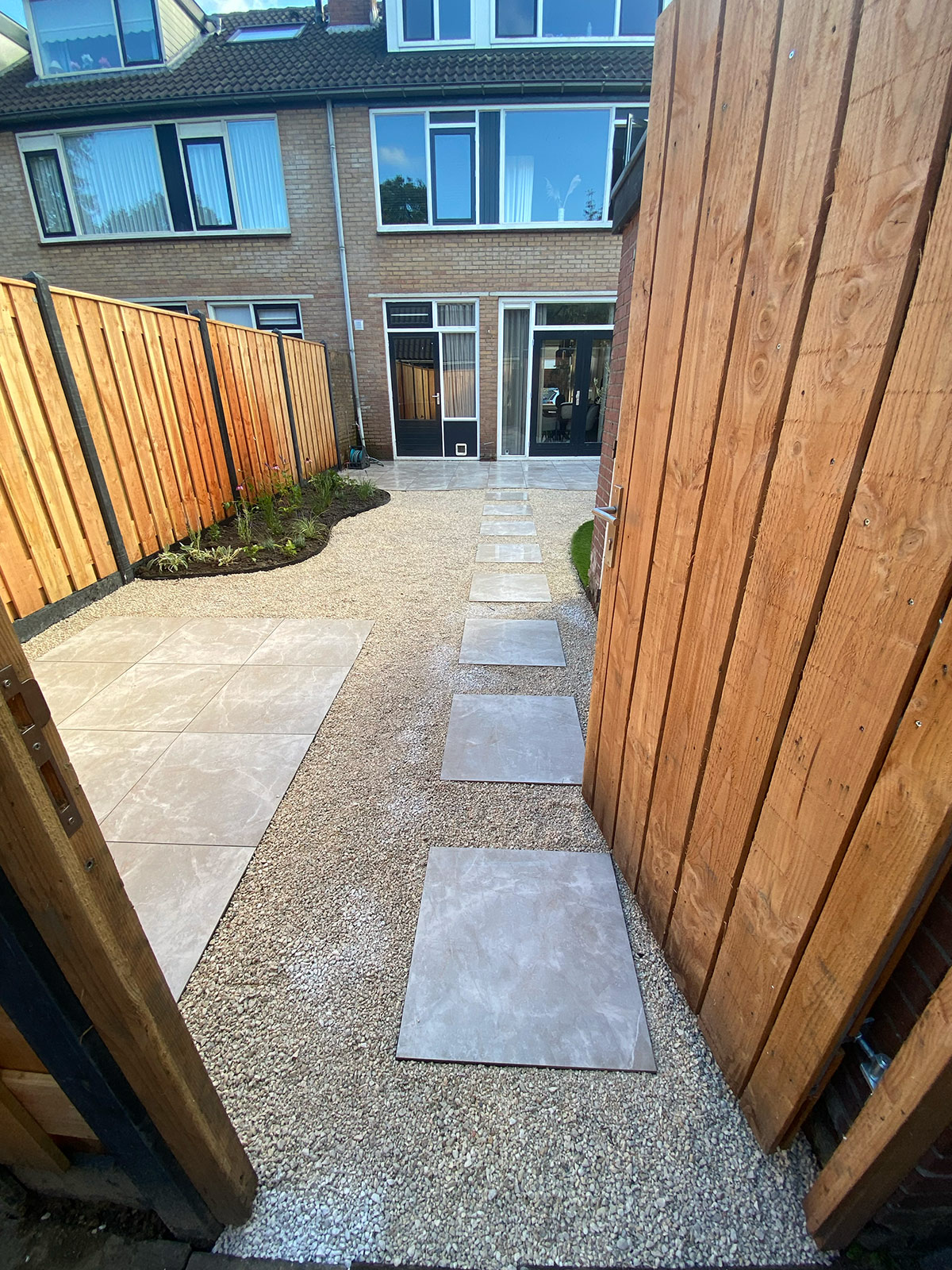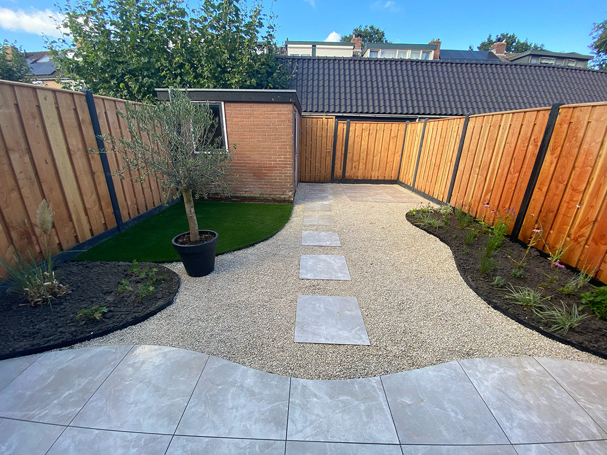 Voor deze opdrachtgever uit Nijkerk legden we niet alleen de voortuin maar ook de achtertuin aan. De combinatie van een 60x60x4 cm Cerasun Lucca Beige tegel – keramiek op beton – en het Yellow Sun Marble grind geeft de tuin een geheel eigen karakter. De warme maar strakke uitstraling wordt versterkt met de kantopsluitingen van matzwart staal. Hiermee krijgt het groen in de tuin nog meer nadruk. De Solitaire olijfboom is prachtig en die wordt naarmate hij ouder wordt alleen maar indrukwekkender.
